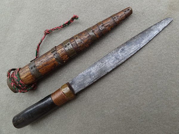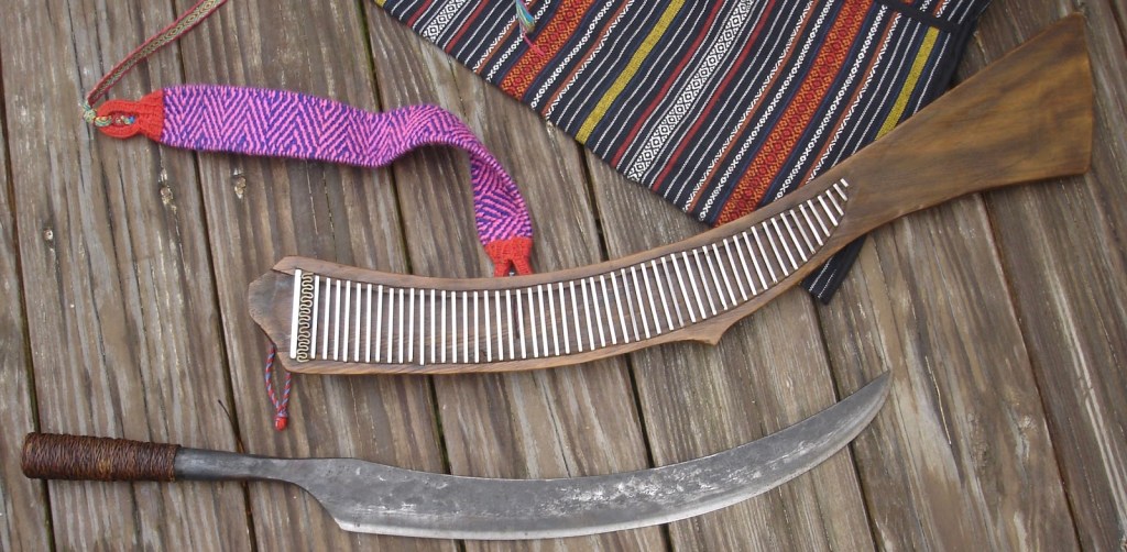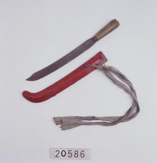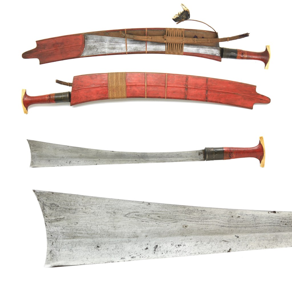 The Kachin, Naga, Apatani, and Deng people nearby use a variety of knives that not only similar to Taiwanese knives, but also have a tentative link to a much older, widespread design. The most eye catching feature of these knives are the scabbard that strongly resembles those in Taiwan, especially with the evenly spaced strips of rattan that secure the blade in the scabbard. However, the features that are less similar to Taiwanese knives perhaps draw more interesting connections that have broader implications. A connection to the machete/“bush” knives of Thailand and the Cambodian Kambet Bantoh can be drawn as the design is nearly identical to a long-handled variant of the Naga dao.