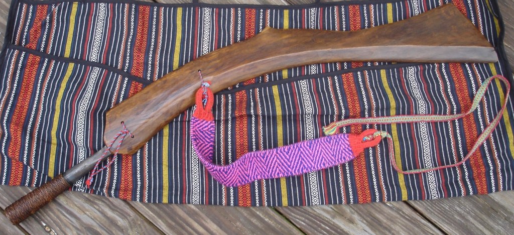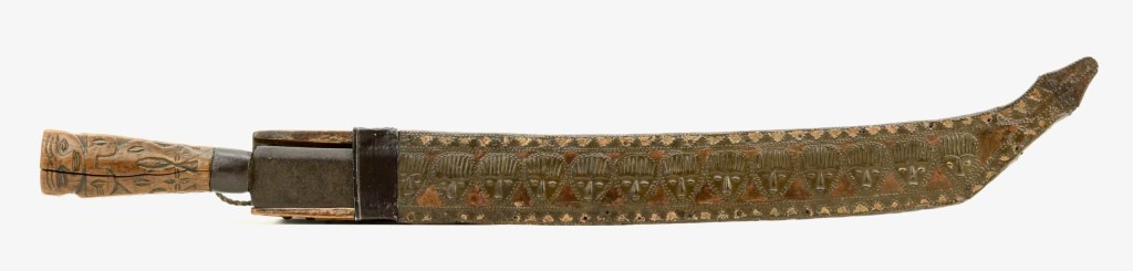 In Mainland Southeast Asia, the Dab/Dha type sword seems to have taken over as the dominant type of blade for the prestigious around the Middle Ages, but more archaic features may have been retained in farming implements and bladed tools like the Kambet Bantoh and related machetes/axes. These axes/tools along with other types of blades were spread to Island Southeast Asia, giving rise to traditions such as the Bolos of the Philippines and Parangs, Kalinga axes of the Cordillera’s, and other knives/swords of the Dayak, with many of these knives having diversified greatly. In both the Philippines and Malaysia, one sided scabbards are still being uses and were possibly once widespread. And throughout the region, the use of both wooden and socketed handles reflects the duality of these knives as both weapons and tools.