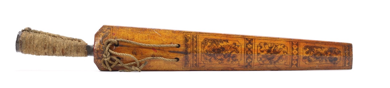 In most Northern knives, the scabbard consists of a plank of wood with a recess carved into one side, with wires stapled across the opening to keep the knife in place, but usually, the friction fit alone is enough to keep the knife in place. An explanation often given is that these open sided scabbards prevented the trapping of moisture around the knife. Traditionally, these scabbards are either trapezoidal in shape for straight backed knives, or for curved knives, follow the shape of the blade and feature a “stock”at the end of the handle, often held when unsheathing the knife. This stock is often the main varying feature between different designs. Many have tried to make the case that these variations in scabbard design could be used to differentiate the knives used by different peoples; however, given that we often see the same variations in the scabbards used by each tribe, it is likely not a reliable indicator. These stocks either resemble a rough diamond pattern, with protrusions on both sides or a “gunstock/fishtail”, with a protrusion only on the bottom side. Back in the old days, long tassels of human hair from victims of head hunting would have been used to decorate the stock. The scabbard is carved to fit the entire blade and over hang a bit, with “throat” of the scabbard is carved into the shape of the “finger guard”. This serves as a sort of platform for the thumb to push off as the knife is unsheathed. According to some tribesmen, the wood of scabbard can be used as kindling for fire, and may have been made of easily flammable wood for this purpose.