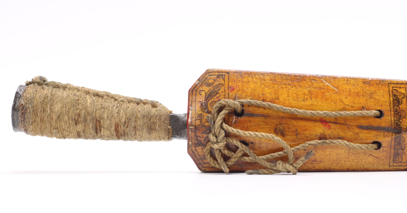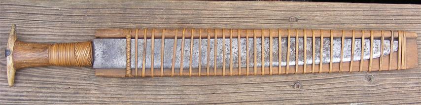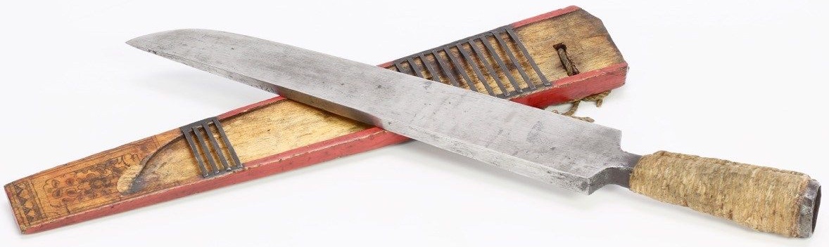 The Dayaks of Borneo continued to live traditionally into the modern era. Integral to their culture and way of life are the large varieties of knives, swords and bladed tools unique to their culture. The Parang knife, Pandat, and Mandau swords all belong to the same family of bladed tools, with some like the Mandau and Pandat occupying a higher status as a weapon of war. An interesting example, the Parang Latok, the utility version of the Pandat used by the Bidayuh of Sarawak, can often be seen with an open sided scabbard. The explanation usually given by the Bidayuh is that the open sided scabbard prevents wood chips and dust accumulating in a conventional scabbard. Perhaps what is more telling is the way scabbards are made in the region. Recesses are carved into 2 pieces of wood and sandwiched together to fit the blade. Instead of using any adhesive or nails, woven rattan(Simpai) are used to wrap the 2 sides of the scabbard together. This type of construction easily lends itself to be converted into an open faced scabbard, as all it takes is removing one side of the scabbard and adjusting the simpai wrap.