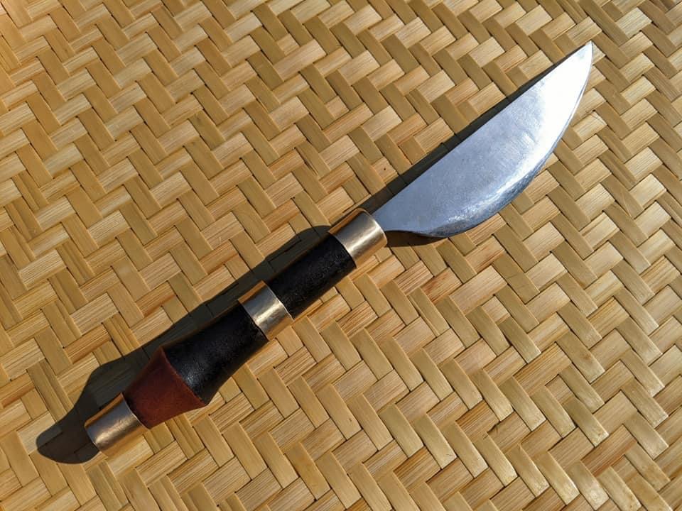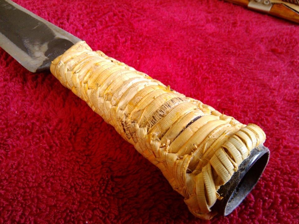 Two styles of handle construction seem to be prominent among these knives, with neither dominating in any one region. One style is the simple socketed handle, present on knives throughout Taiwan of all lengths and designs. Generally, the top end of the socket is left open. One explanation was to prevent moisture buildup within the socket. Smaller blades of socketed construction were often hafted for use as spears, javelins, and polearms, and were also used in the unique practice of mounting a “bayonet” on longbows when closing the distance with animals or enemies. The wooden handle, while not allowing for such versatile use, is nonetheless widespread. The tang of the knife was shaped into a spike, then burned or rammed into a conical piece of wood, and held by friction. While the tang wasn’t usually long enough to fully pass through the handle, when it did, it wasn’t penned, but often just bent over, much like a Chinese meat cleaver. The wooden handle, to prevent splitting, was reinforced with wire or organic material such as rattan or ramie fibers wrapped/woven around as a grip. Sometimes, a metal ferrule is fitted at the junction between blade and handle, however, this feature is mostly seen on knives made today and rarer in the past. The blade was rarely pinned to the handle or glued, although there is a method attested by some, where the tang was deliberately rusted in the handle for a better friction fit. Both types of handles were slightly oval in cross section to facilitate edge alignment.