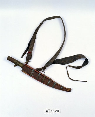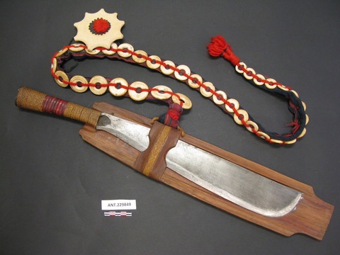 The Tsou, living in the region surrounding Alishan national park, use these knives called poyave no sungcu, meaning straight knife, accompanied by with a Kacace, an ornate belt beaded with cowrie shells and other decorative materials. The sheaths of these knives are often painted red as red was believed to be the favored color of their war god, and a wooden strip was also often attached to the back of the sheath. Unlike many sheaths of other peoples in Taiwan, in addition to wire, Tsou sheaths would also have long, flat places of metal varying in width. In the past, villages had forges which, according to Japanese records, were set up in part, by Han smiths from the lowlands. The suspension system for the knives were different in the north and south, as in the north the Poyave would’ve been tied to the waist by sword belt and shoulder strap whereas in the south, the swordbelt would be the only means of suspension.
