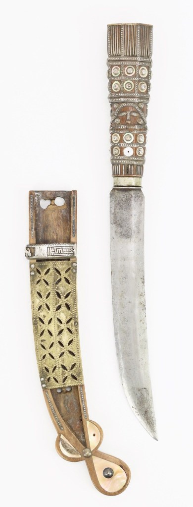 An interesting feature of many Amis knives is the handle, which is asymmetrical, and unlike most knife handles in Taiwan. This takes many forms, either as a outwards protrusion near the bottom of the handle, or a handle that is entirely curved, much like those of many Bolos and Parangs in Southeast Asia. While this feature is common among normal utility knives of the Amis, it is most commonly present in a type of knife known as a “gift knife”. These knives usually have long, curved, narrow blades with fittings entirely made of ox horn, inlaid with mother of pearl. More often then not, these ox horn scabbards are fully enclosed, unlike the one sided scabbards used throughout Taiwan.
