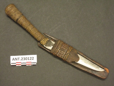 The knife is 44cm in length, and the scabbard showed standard characteristics such as the wires used to secure the knife, and also features a variation of the upturned end that is nearly ubiquitous in all the scabbards used by the Indigenous Taiwanese. The handle is the only one of its kind known, as most handles of Formosan blades narrow towards the blade, whereas this particular example is waisted. The blade profile resembles neither Southern nor Northern styles of blade, but rather has features of both. It has a single bevel cross section, like Northern blades, but the junction between the handle and blade resembles that of Southern Paiwanic blades. The blade profile resembles a fusion of the 2 styles, with a gradual taper which suddenly curves at the last section into a tip, but remains narrow at the base. It is possible that this particular knife represents an early type of knife from which the other styles developed from, but it could also represent a regional style no longer in existence.