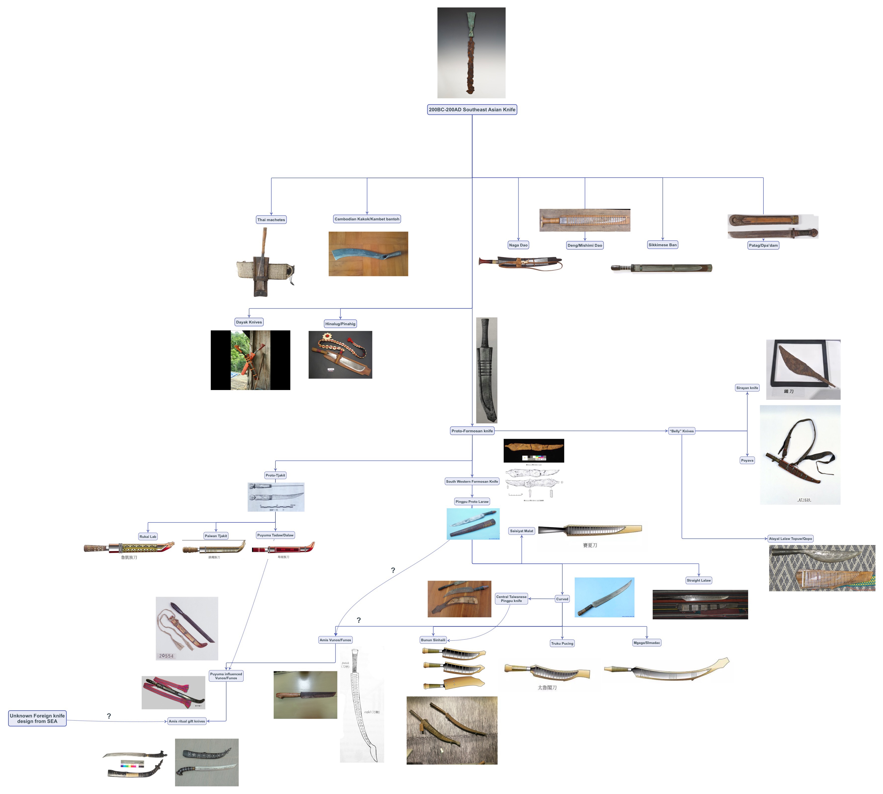 We can perhaps start to piece together a rough picture of how bladed tools and knives spread throughout Southeast Asia with an understanding of how some archaic features managed to be preserved in Taiwan. Broadly speaking, around 200 BC, metallurgy(and by proxy bladed tools) spread quickly throughout island Southeast Asia along well established trade routes previously used for the jade trade. As the conditions for preservation of iron is particularly poor in the region, we must rely on surviving cultures of bladed tools to extrapolate what was being made and spread at the dawn of the Iron Age in Southeast Asia.