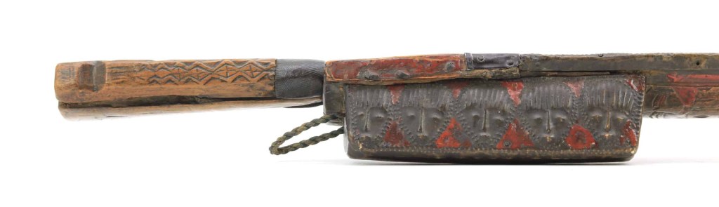 The emphasis on decoration is likely linked to the affinity of Rukai and Paiwan tribesmen for wood carving, with the handle and scabbard serving as a surface for displaying craftsmanship. Motifs/totems are hammered in metal and carved into the wood, common ones being faces, often representing ancestors, and the “hundred pace pit viper”(Deinagkistrodon), an animal of significant importance to the Paiwan, Rukai, and Puyuma.